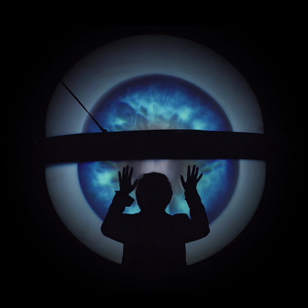 The installation consists of two acrylic glass hemispheres on which the images of the Eye or the sun are projected from the inside. The hemispheres are connected by a central technical disk that houses the two video projectors alongside the required optical equipment (lenses and mirrors), a network router, a sound card, and the several power supplies and cables. Eight loudspeakers are positioned around this technical equator, providing spatialised sound, as well as sixteen infrared cameras which allow the Eye to sense motion in its vicinity. Finally, two more wide-angle infrared cameras are installed centrally on both sides of the equator disk allowing for hand detection through the semi-transparent hemispheres.