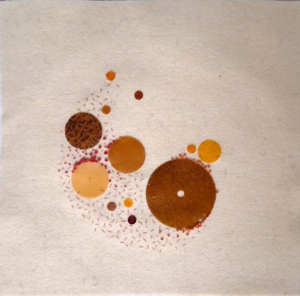 The artwork “Pulsion” is a small-scale contemporary piece measuring 20 by 20 cm. Its primary structure is created through embroidery on wool. Upon examining the surface, the viewer discovers intriguing textures resulting from the delicate application of biomaterials or biopolymers. These organic components are made using discarded orange peels and coffee grounds. The biomaterials are emphasized as fundamental to the essence of the artwork, going beyond mere decorative elements.